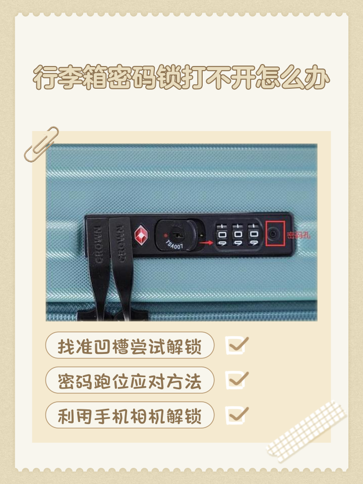 7、可以尝试以下方法开启忘记密码的三位数密码箱尝试默认密码与常用组合多数行李箱初始密码为000,部分四位数为0000或1234,可直接尝试还可以试试常用组合,像重复数字666888生日手机号后三位等强光照射法适用于机械锁先用手电筒或手机闪光灯照射密码锁齿轮下方,找到每个数字轮上的。