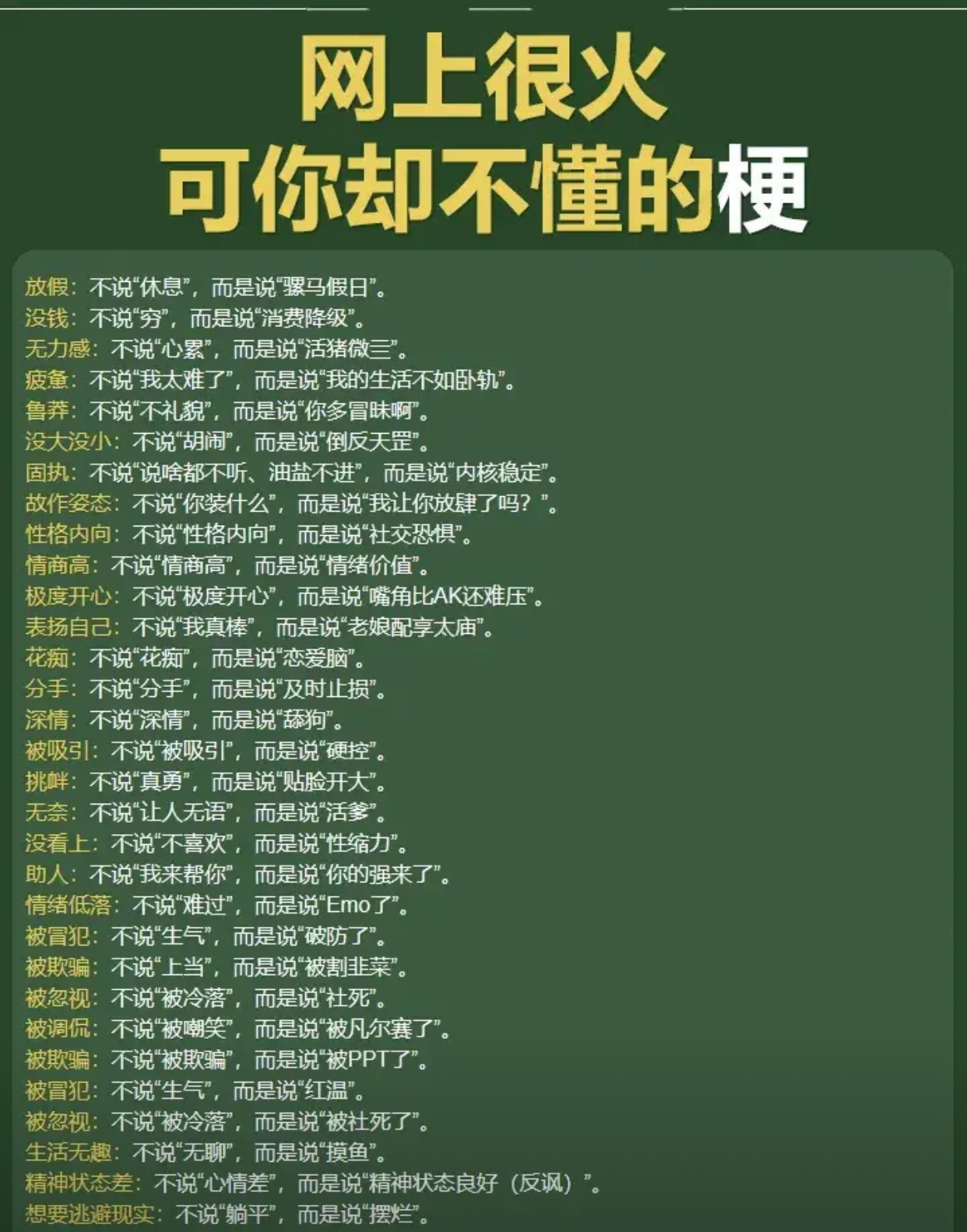 网络语“很low”的意思是指网络用语的质量很差很糟糕具体来说质量低劣这里的“low”用来形容网络用语时,通常指的是这些用语在表达上不够准确不够精炼,或者用词不够恰当,给人一种粗俗不雅的感觉缺乏品味在某些情况下,“很low”也可能用来形容网络用语缺乏品味或格调,与高雅精致。