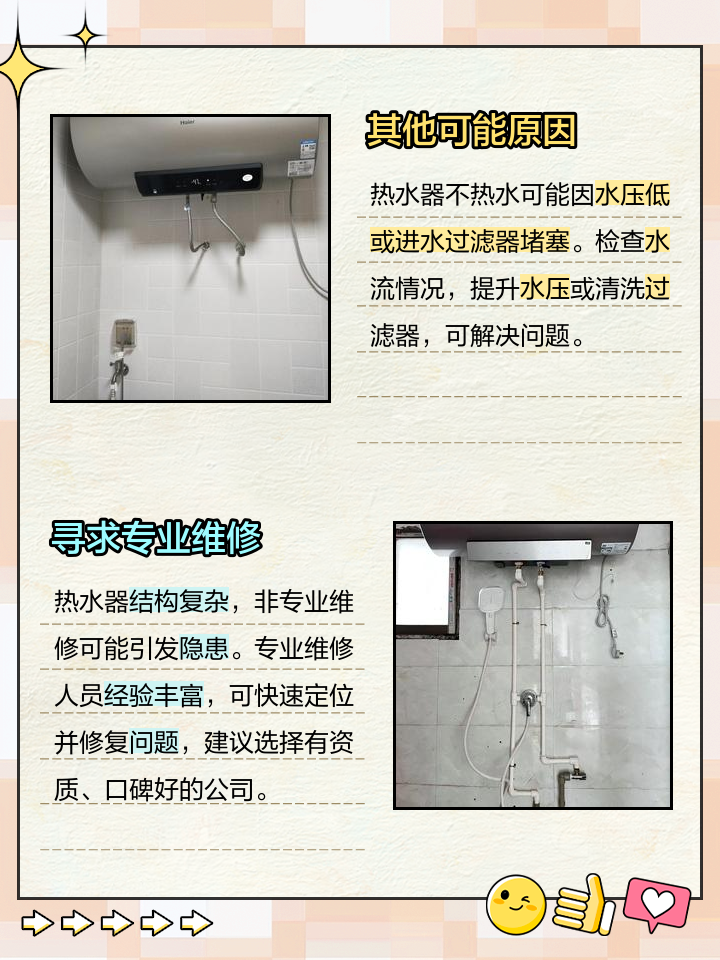 电热水器不出热水可能有以下原因电源问题电源插头未插好检查电源插头是否牢固插入插座电路保险丝熔断查看电路保险丝状态,如有熔断需更换外部电源开关关闭确保电热水器的外部电源开关处于打开状态热水器加热元件故障电热棒损坏长时间使用后,电热棒可能会损坏,导致加热效率降低或无法加热电热棒结垢电热棒表面结垢也会影。