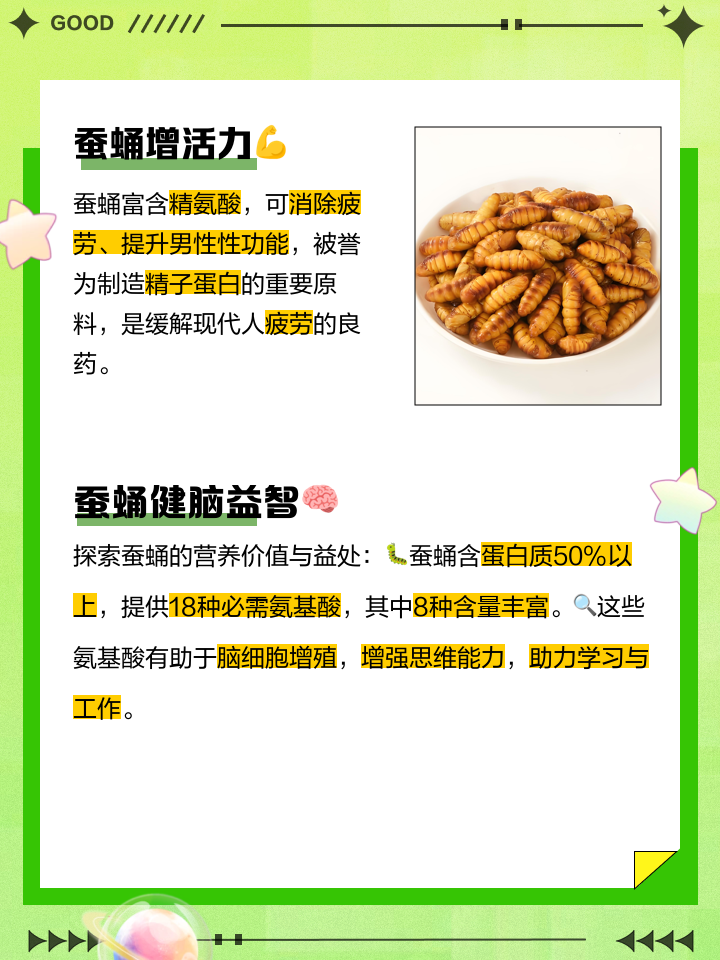 蚕蛹不宜与海鲜同食以下是具体原因避免过敏蚕蛹本身对于大多数人来说是安全的,但部分人属于易过敏体质当蚕蛹与海鲜一同食用时,可能会增加过敏的风险注意事项 尽管蚕蛹营养价值极高,富含蛋白质和多种人体必需的氨基酸,但在食用时仍需注意个人体质和过敏史 如果在食用蚕蛹后出现任何不适;2 需要注意的是,某些人可能对海鲜过敏,如果在这种情况下同时食用蚕蛹和海鲜,可能会触发或加剧过敏症状3 此外,务必避免食用发霉变黑长霉有苦味或呈淡粉色的蚕蛹这些迹象表明蚕蛹不新鲜,可能含有有害物质食用这类蚕蛹可能导致腹泻腹痛等消化系统问题,严重时甚至可能中毒尽管蚕蛹富含蛋白质,但也不应过量食用。