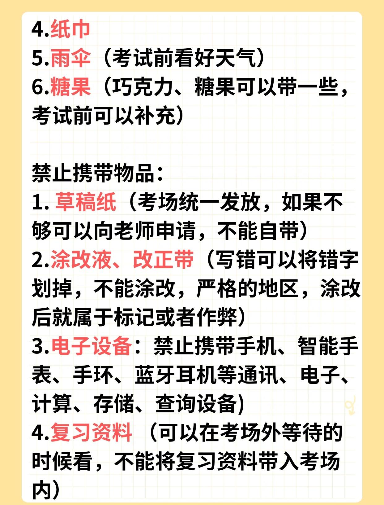 一证件 有效居民身份证考生必须携带本人有效居民身份证原件,这是进入考场和验证身份的必要证件准考证考生需打印准考证,并按照考点要求携带准考证正反两面在使用期间均不得涂改或书写二文具 2B铅笔用于涂写答题卡上的选择题答案橡皮用于擦除答题卡上的错误涂写中性水笔建议多带。