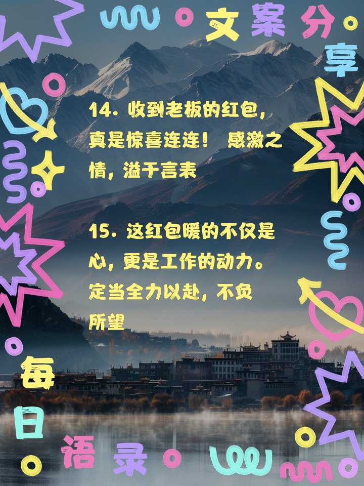 1感谢您发红包的慷慨,这份善意让我倍感温暖2您的红包如同春天的阳光,温暖了我的心房,非常感谢您3收到您的红包,我如同收到了一份特别的祝福,衷心感谢您的关怀4您的红包,是我今天收到的最惊喜的礼物,感谢您的心意5在这个平凡的日子里,您的红包让我感受到了不平凡的温暖;谢谢老板红包的语句如下1谢谢老板,老板大气2老板好手笔,我感觉跟着你是对了3受宠若惊,老板人太好了,我都等不及要回报老板了4感谢老板,老板好人5感谢老板的红包,老板真是体恤民心啊,跟着老板有肉吃6老板是相当阔绰啊,不愧是老板,佩服得五体投地7谢谢老板,我。