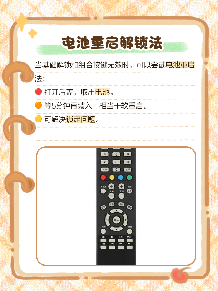 3、空调遥控器被锁定时,多数型号可通过同时长按温度+和温度键解锁不同品牌可能有差异,以下是具体方法一通用解锁操作 若遥控器屏幕显示“锁”图标或按键无反应,优先尝试两种组合键 1 同时按住温度+和温度键,持续35秒直至锁定标志消失 2 部分机型需按模式+;空调遥控器出现一个锁,可以通过以下多种方法解锁组合键解锁通用方法同时长按“模式”和“温度+”键5秒,这是格力美的等主流品牌的常用解锁方式当遥控器屏幕上的锁标消失或听到“滴”声提示时,表示解锁成功其他组合键部分型号可能需要采用其他组合键,如同时长按“温度+和温度”键5秒;方法二,复位键解锁有些空调遥控器上有复位小孔,旁边印着“复位”两个字或者英文“RESET”,译为重置用牙签或者其他的尖锐细小的物体戳一下这个孔,空调就能被解开因为戳一下,遥控器的记忆数据会被清除,就会解开对空调的锁定方法三,抠电池解锁打开遥控器的电池盖子,将电池抠下来,5分钟后;当您发现空调遥控器上显示一个锁的标识时,这意味着遥控器已被锁定,此时无法进行任何操作要解除锁定状态,您可以尝试同时按下遥控器上的加号和减号键,这样通常可以解锁另一种方法是拔下遥控器的电池,等待几分钟后再重新装上,遥控器就会恢复到出厂设置在使用空调遥控器时,请注意它是一种低耗。