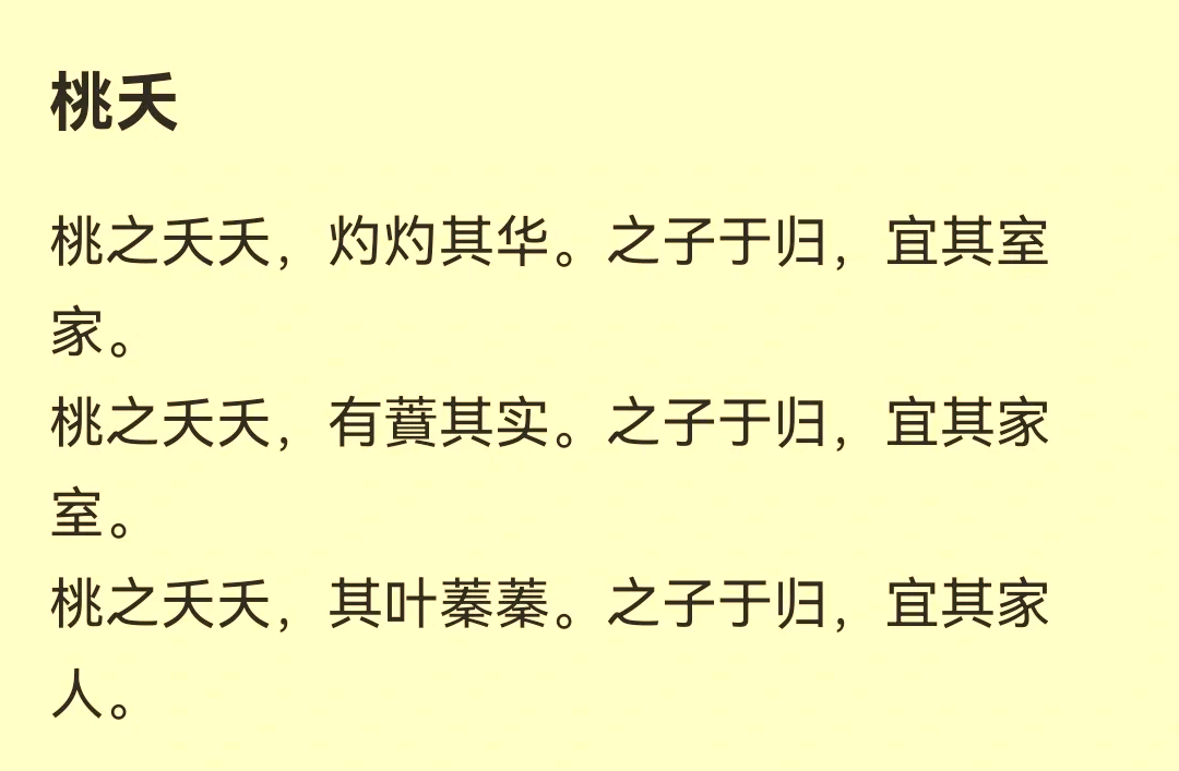 1、原文 桃之夭夭,灼灼其华之子于归,宜其室家 桃之夭夭,有蕡其实之子于归,宜其家室 桃之夭夭,其叶蓁蓁之子于归,宜其家人 译文 桃花怒放千万朵,色彩鲜艳红似火这位姑娘嫁过门,夫妻美满又和顺 桃花怒放千万朵,硕果累累大又多这位姑娘嫁过门,早生贵子后嗣旺 桃花怒放千万朵,桃叶纷呈真茂盛这位姑娘。