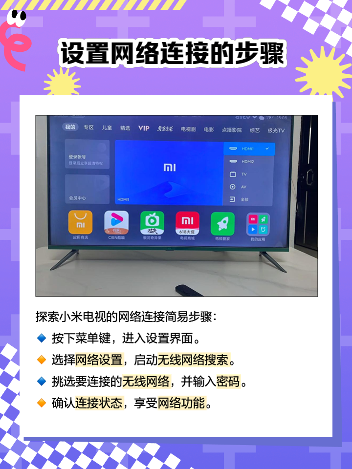 9、小米网络电视机收看电视台节目的方法有以下几种连接有线电视如果家中已有有线电视信号,可通过HDMI或AV接口将有线电视线连接到小米网络电视机上在电视机菜单中选择对应的输入源,即可收看有线电视节目连接数字电视机顶盒将数字电视机顶盒与小米网络电视机通过HDMI或AV线连接在电视机菜单中选择与。