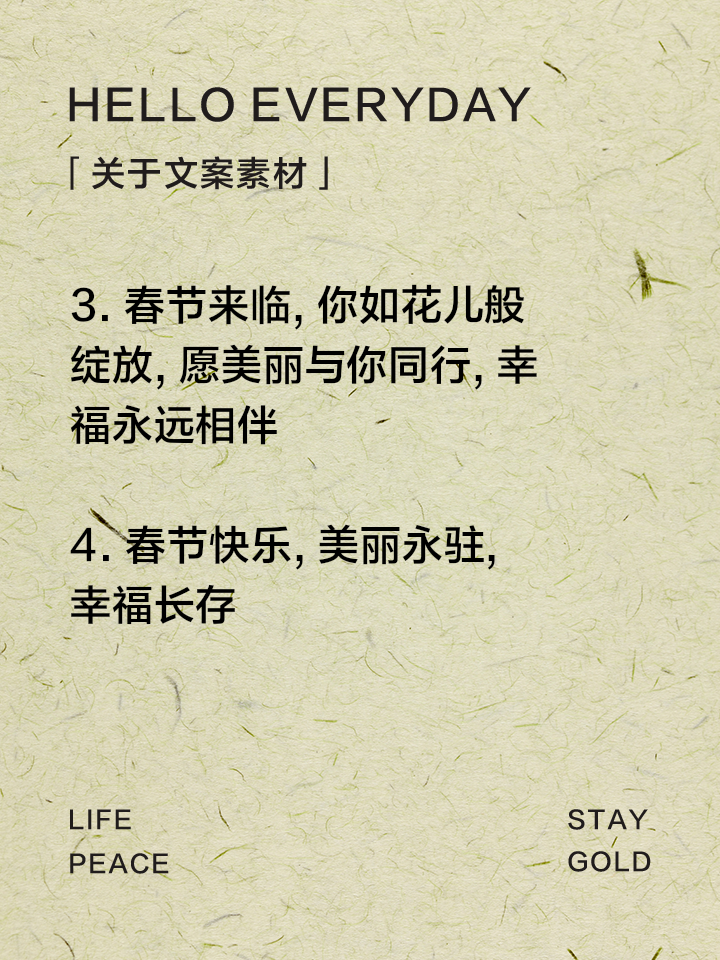 人们会享受到团圆,在这个特殊的时节里,欢乐和美好的生活写一篇短句,题材不限,以唯美短句为主,描绘春节的美好时刻在这篇文章中,我将以春节经典唯美说说为主题一“祝愿每个家庭都能够团聚,幸福安康,春节到了”二“让我们感受到生活的快乐和美好,春节,一个温馨的节日”三“分享。
