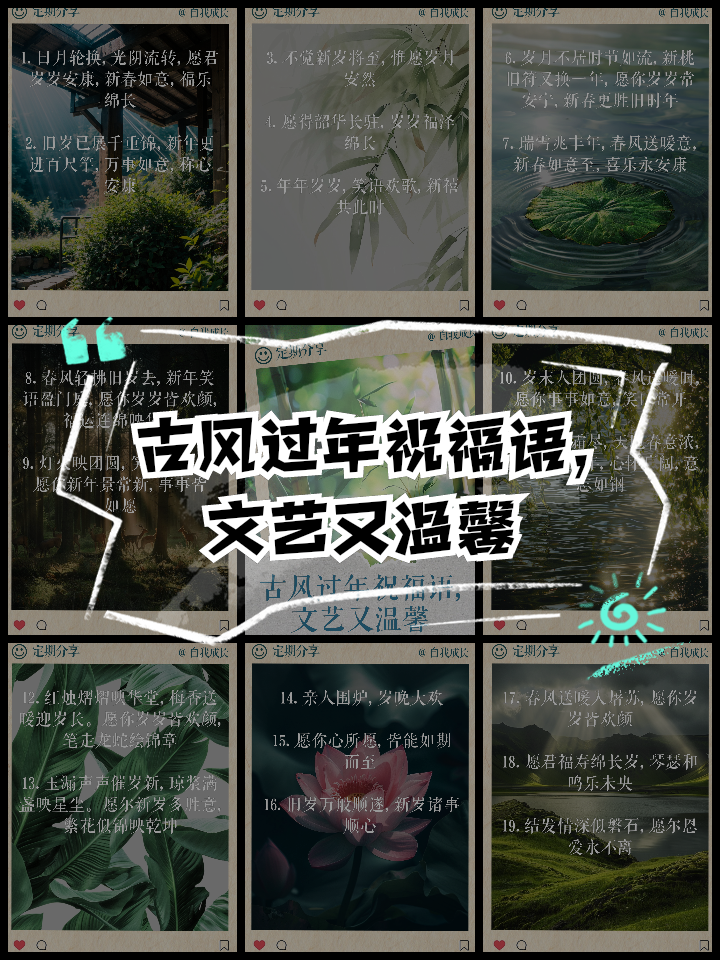 9新年祝福语古风文案新春佳节喜洋洋,年年丰收有余粮,快马加鞭来脱贫,乐歌乐舞唱安康,吉星高照进亿户,祥云四起安八方10过年说祝福语,这本就是人们对未来一年的期望,现在人一般都说恭喜发财,期望来年能发发财而在古代,人们一般都说什么呢11走过了山山水水,脚下是高高低低经。