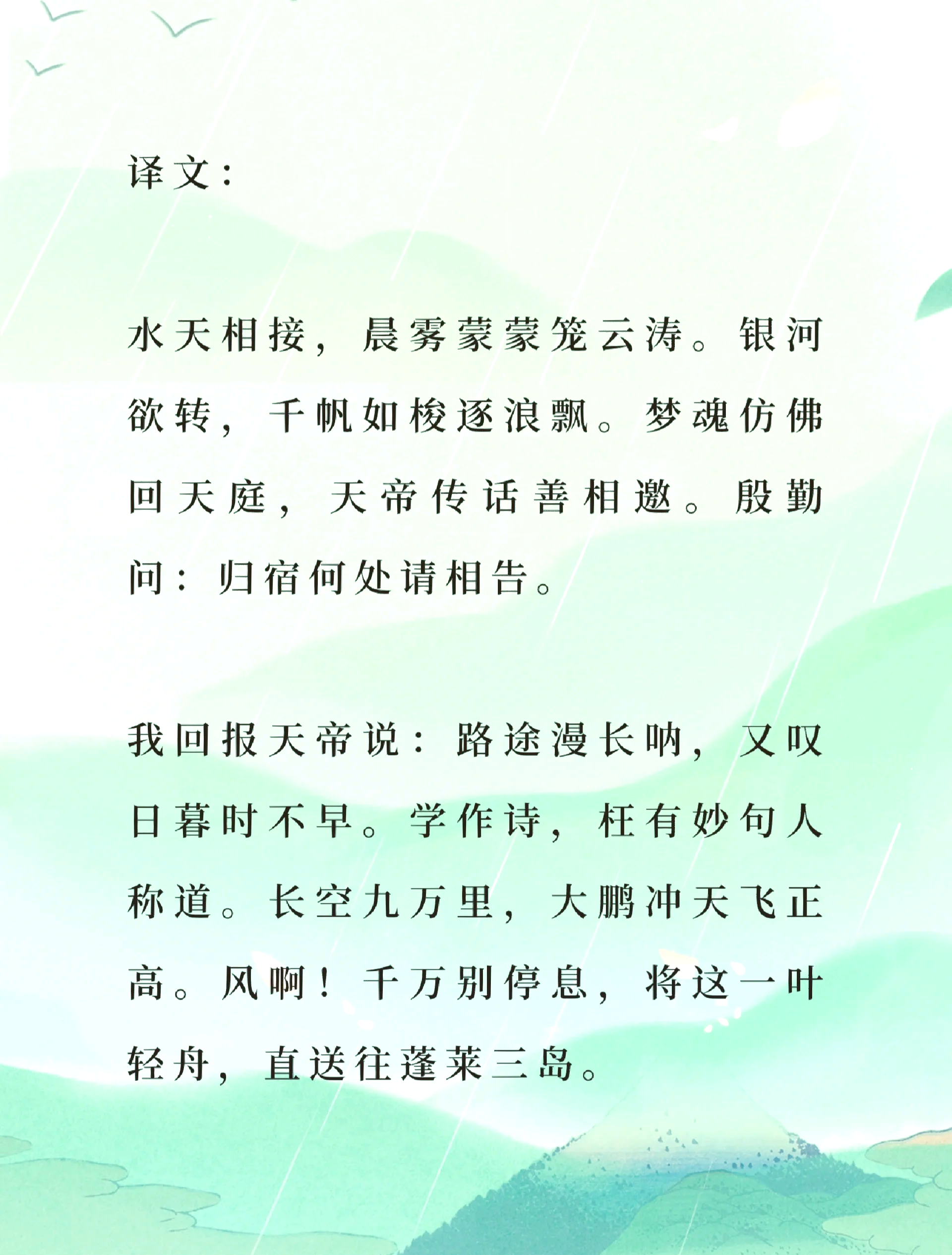 渔家傲原文翻译水天相接,晨雾蒙蒙笼云涛银河转动,像无数的船只在舞动风帆梦魂仿佛回天庭,听见天帝在对我说话他热情而又有诚意的问我要到哪里去我回报天帝路途还很漫长,现在已是黄昏却还未到达即使我学诗能写出惊人的句子,又有什么用呢长空九万里,大鹏冲天飞正高风啊千万。