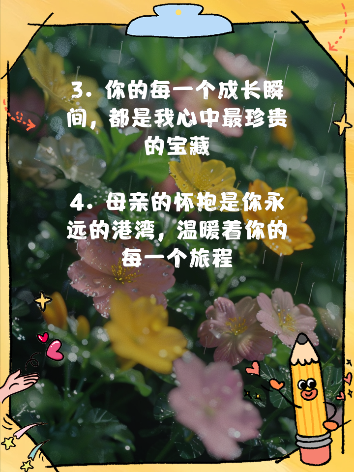 3、1 表达陪伴孩子幸福感受的句子 陪孩子,在一起,便是最幸福的时光无论是逛街玩耍还是聊天,都能感受到满满的幸福 孩子的快乐时光,也是我们最幸福的时刻愿他们每天都能无忧无虑,快乐成长2 寄托对孩子爱与期望的句子 爸爸妈妈的两颗心乘起来等于翅膀,为你护航无论世界多么漫长;陪伴孩子是幸福的,以下是一些表达这一观点的句子陪孩子在一起,真的就足够了这种简单的陪伴,足以让人细细品味生活中的细微幸福陪孩子,美食相伴,共度幸福时光与孩子一同享受美食,共度美好时光,是无比幸福的体验每天陪孩子们在一起,是我工作以来最幸福的日子尽管可能面临工作上的变动;34孩子的世界充满了欢声笑语和玩耍,让我们一起加入他们的游戏世界35与孩子的相处让我们更加有爱心和耐心,让我们好好表达这份爱36孩子的成长需要我们的支持和鼓励,让我们用爱心和信心支持他们的成长37陪伴孩子是一份幸福的事情,让我们用心去感受这份幸福38孩子是生活中最美好的存在;30无论发生怎样的变故,不要打破生活原有的规律,要按时吃饭,按时睡觉31妈妈需要休息一会儿,你要好好照顾好自己哦32宝贝,祝你生日快乐愿生日带给你的欢乐中蕴涵着一切美好33作为父亲,能陪孩子在一起,就是一种幸福不要管去做什么,不要管孩子有多不听话34能一直美美滴还能。
