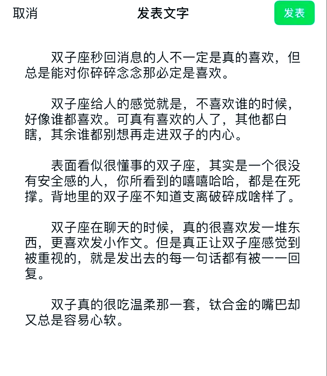 6、双子座女生喜欢一个人的表现主要有以下几点被动但话痨双子座女生通常不会主动与人聊天,但当你找她时,她会变得非常健谈,瞬间变成话痨如果她对你表现出这种态度,那很可能意味着她很喜欢你不依赖你的金钱她们不愿意一直让男生花钱,会想法设法回馈,比如请你吃饭后给你买奶茶,看电影时给你。