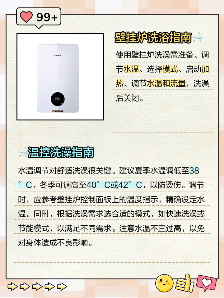 专门的热水器通常在设计上更注重能效和舒适性,能够更高效地加热并提供稳定的水温综上所述,虽然燃气壁挂炉在技术上可以提供热水用于洗澡,但考虑到舒适性安全性和能效等方面的因素,通常不建议使用燃气壁挂炉来洗澡如果需要大量的生活热水,最好还是安装专门的热水器来满足这一需求;另一方面,燃气壁挂炉的热效率会随着使用时间和频率的增加而降低长期频繁用于洗澡,设备持续高负荷运转,会加速零部件的磨损,增加维修成本和安全隐患而且如果安装或使用不当,比如通风条件不好,燃气燃烧不充分,可能会产生一氧化碳等有害气体,威胁使用者的生命安全此外,燃气壁挂炉的使用寿命一般在15;新的燃气具法规在7月1日实施,规定了卫生间冲凉房等通风效果,地方不可以安装壁挂炉,因为怕发生燃气事故,水蒸气会导致原件老化腐蚀导致壁挂短路爆炸,法律不会考虑卫生间的通风效果燃气热水器在使用过程中需要消耗大量的氧气,本身卫生间都是封闭空间,如果造成卫生间氧气缺失,在洗澡过程中容易造成缺氧;一方面,存在安全隐患燃气壁挂炉使用燃气燃烧来加热,如果通风条件不好,燃烧不充分会产生一氧化碳,这是一种无色无味但有剧毒的气体,容易导致使用者中毒,威胁生命安全而且燃气泄漏也可能引发爆炸等严重事故另一方面,使用体验上有不足燃气壁挂炉的热水供应能力有限,当多人连续洗澡或者在用水高峰;1 自7月1日起实施的新的燃气具法规对卫生间等空间的通风要求作出了明确规定,禁止在通风不良的卫生间安装壁挂炉,以防燃气事故发生2 卫生间内的水蒸气环境可能导致壁挂炉内部原件老化和腐蚀,增加短路和爆炸的风险,这是法规不允许在卫生间安装壁挂炉的另一原因3 法规并未考虑卫生间的自然通风。