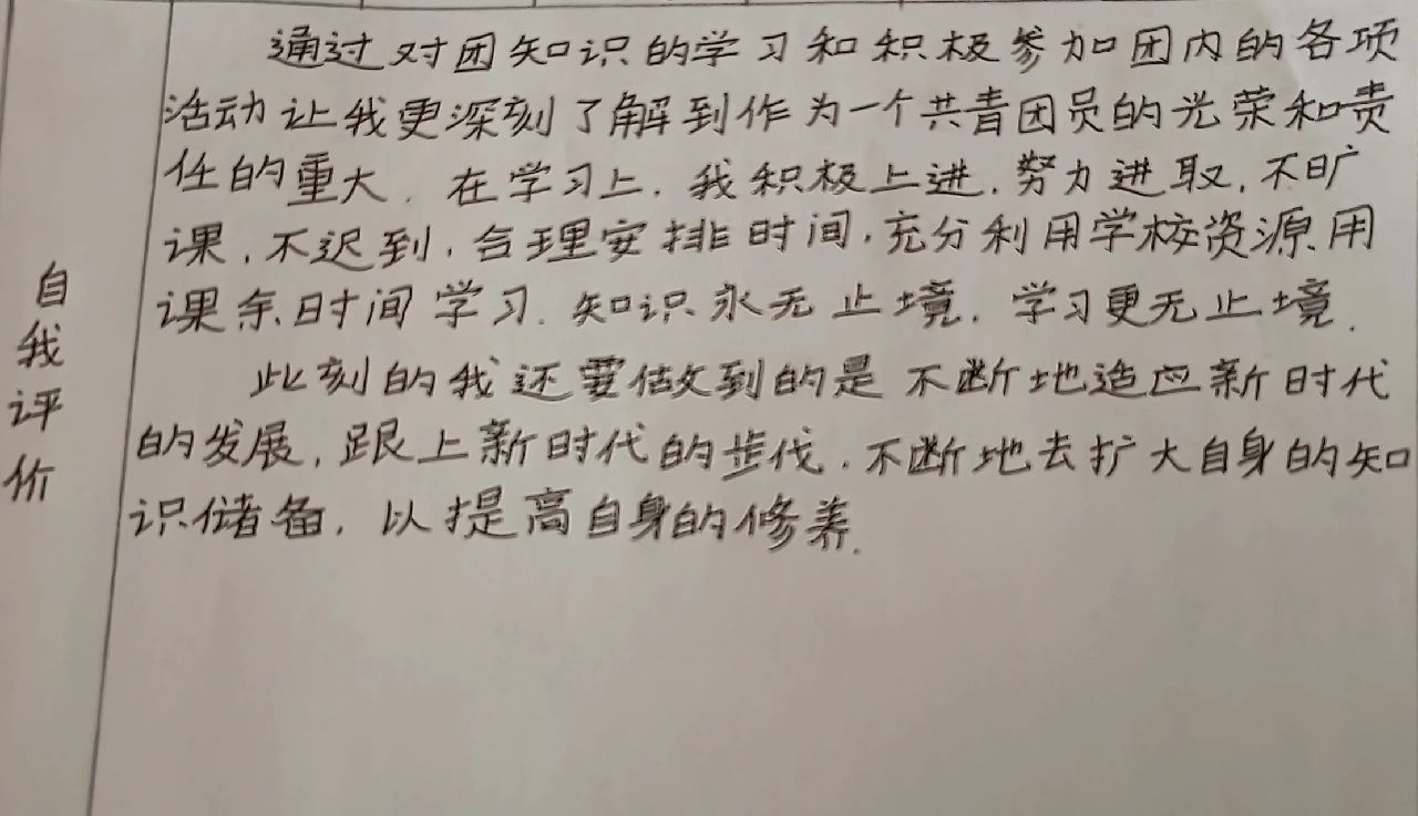 我作为团员,一直热爱祖国,尊敬师长,与同学们团结友爱,乐于助人,是老师的好助手,同学们的好伙伴在校期间,我勤奋学习,积极向上,喜欢与同学们探讨问题,解决问题,并积极参与班级和学校组织的各种课内外活动在家时,我尊敬长辈,常常帮助父母做家务,是一个好孩子,也是邻居的好榜样经过初中的。