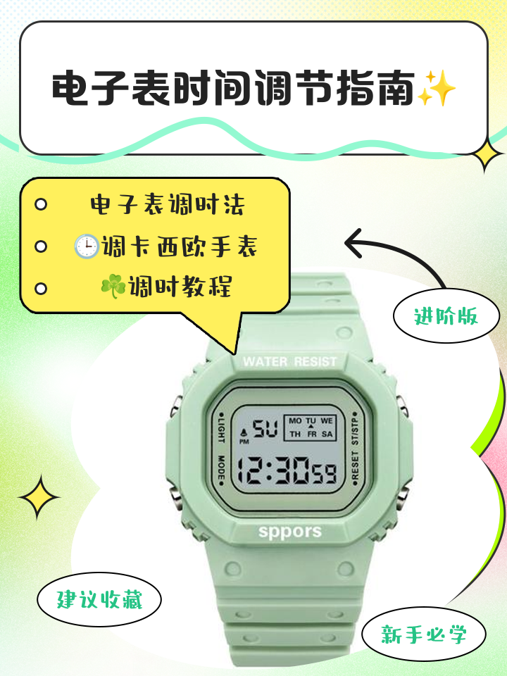 一般电子表通常按键布局中,左上角按键为LIGHT,右上角按键为STSP,左下角按键为MODE,右下角按键为RESET调整时间按一下LIGHT键显示时间界面,多次按MODE键进入时间调整模式按STSP键调整秒,按RESET键切换至分的调整,再次按STSP键调整分,继续按RESET键直至小时显示,然后按STSP键调整小时。