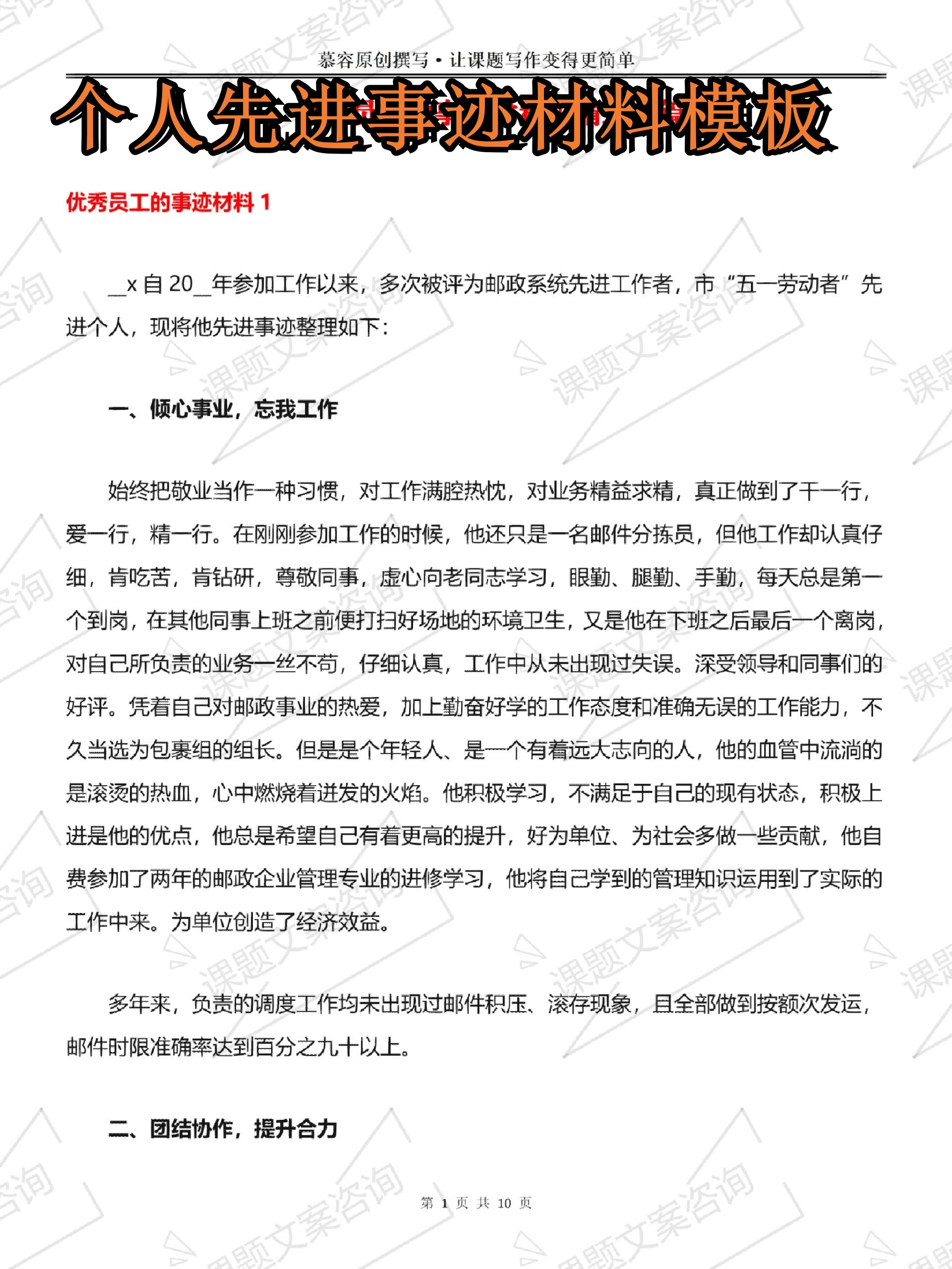 优秀员工迹材料范文精选7篇 在平凡的学习工作生活中,大家都有写事迹的经历,对事迹很是熟悉吧,事迹是为了表扬先进弘扬正气推动工作,对工作学习中涌现出来的先进集体先进人物的优秀事迹如实记载和反映的书面材料那么事迹怎么拟定才能发挥它最大的作用呢?下面是我为大家收集的员工事迹材料范文精选7篇。