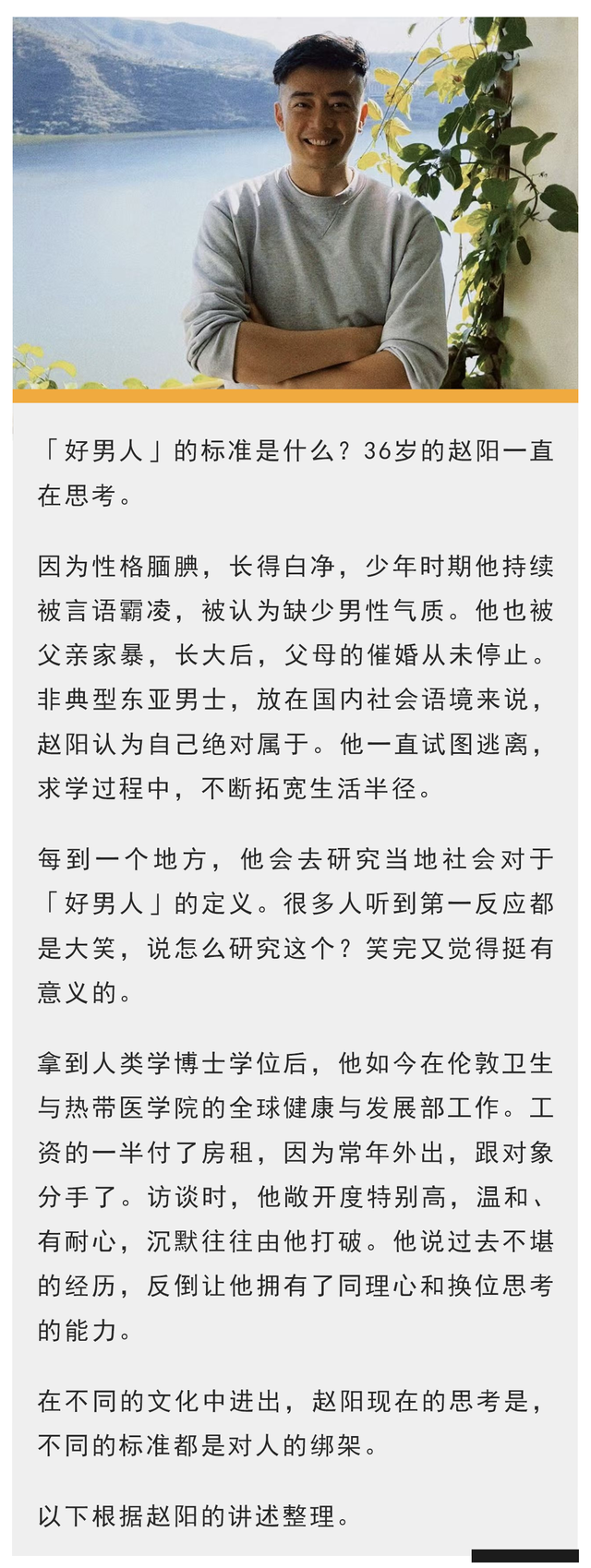 “好男人”的标准是什么每次我说研究社会对于“好男人”的定义,所有人第一反应都大笑,说你怎么研究这个?笑完后,他们又说挺有意义的,“男人太苦了”。
