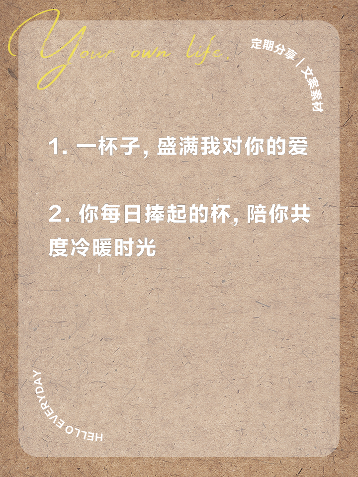3、杯子上刻字可以选择以下内容一霸气内容 简短有力的话语如“生活就像一场游戏,玩得起继续,玩不起出局”,表达一种积极向上不畏挑战的生活态度 幽默风趣如“若有来生,我要做你的心脏,我不跳,你就得死”,增添一丝幽默感,让杯子更加有趣但请注意,选择霸气内容时,要确保内容;1厮守终生,不离不弃2容我爱你,深不见底3一人一心,白首不离4不打扰,是我能给你的温柔5你许了我一米的阳光,却给了我一世的沧桑6时光静好,与君语 细水流年,与君同 繁华落尽,与君老7走在一起是缘分,在一起走是幸福8千与千寻千共苦,一生一世一。