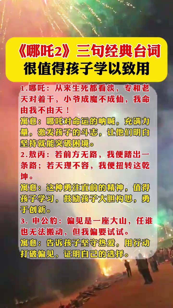 哪吒之魔童降世中的经典台词有以下这些“人心中的成见是一座大山,任你怎么努力都休想搬动”这句话揭示了人们对某些事物或人的固有看法难以改变的现实“我命由我不由天,是魔是仙,我是谁只有我自己说了算”这是哪吒对抗命运坚持自我的宣言“若命运不公,就和它斗到底”体现了;在哪吒之魔童降世中,哪吒以独特的形象和深刻的台词给观众留下了深刻印象他敢于挑战命运,不畏人言,用自强的精神诠释了“我命由我不由天”的核心理念当世人称其为妖怪时,哪吒毅然决定“就当妖怪给他们瞧瞧”,展现了他不屈不挠的斗志他以“小妖怪”自居,逍遥自在,不拘小节,甚至以“;哪吒之魔童降世的经典台词主要有以下几句“生而为魔,那又如何”这句话是哪吒对自己命运的挑战,展现出他敢于面对偏见不惧世俗的勇气“我命由我不由天,是魔是仙,我自己说了才算”这句话体现了哪吒的叛逆精神和对自我价值的坚持,他认为命运应由自己掌控,而非天定“逆天而行斗;我是小妖怪,逍遥又自在,杀人不眨眼,吃人不放盐,一口七八个,肚子要撑破,茅房去拉屎,想起忘带纸哪吒以一种幽默诙谐的方式展现了一个小妖怪的生活态度若命运不公,便和它奋斗到底哪吒面对命运的不公,选择与之抗争到底,展现出坚韧不拔的精神生而为魔那又如何,如果命运不公,我便和它。