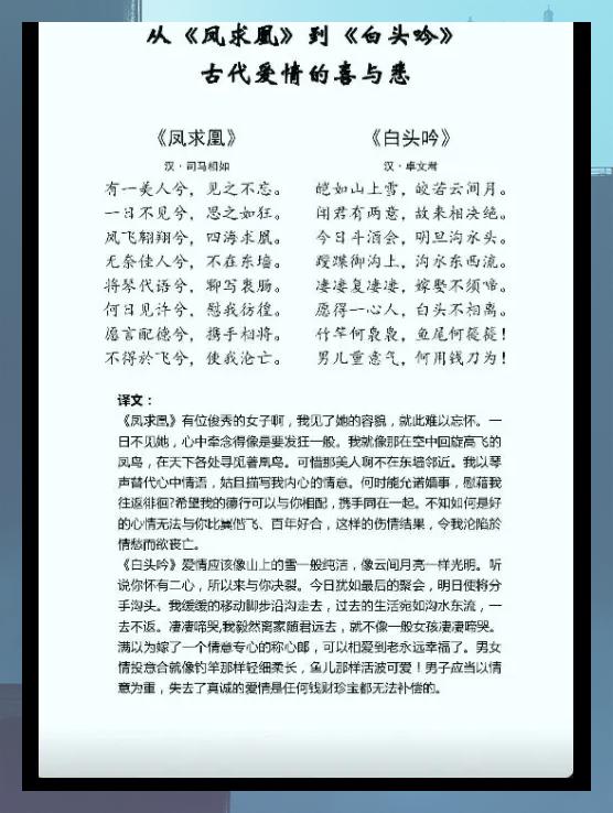 两人的美好爱情故事在卓王孙的宴席中悄然上演卓王孙是靠冶铁发家致富的富商,他宴请宾客时请来了司马相如席间,司马相如姿态潇洒,谈吐高雅,满座的客人都被他的风采所折服在酒兴正浓时,他的好友王吉把一张琴放到他的面前,希望他能弹奏一曲以助酒兴司马相如得知卓文君美貌非凡且文采出众,便弹奏。