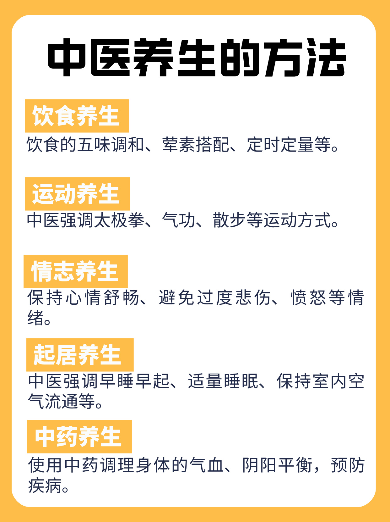 保持室内空气流通定期开窗通风,保持室内空气新鲜,有助于预防呼吸道疾病避免过度劳累根据身体状况合理安排工作和休息时间,避免过度劳累导致身体免疫力下降综上所述,中医养生之法在于调养脾肾顺应自然通过合理的饮食作息运动以及情志调节等方式,可以调和人体内外环境,达到预防疾病延年益寿的。