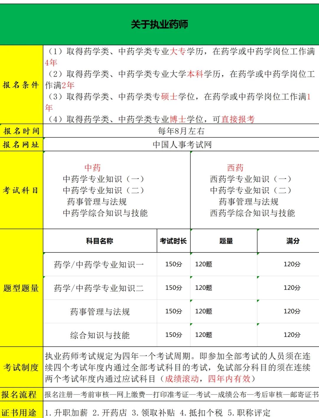 7、对于中专学历的报考人员,若符合原34号文中执业药师职业资格考试实施办法第五条规定的免考两科条件,并在2020年12月31日前申请报名参加考试,其考试成绩有效期按原34号文规定执行,须在一个考试年度内通过应试科目综上所述,报考执业药师需根据自身的学历专业及工作年限情况,选择相应的报考级别。