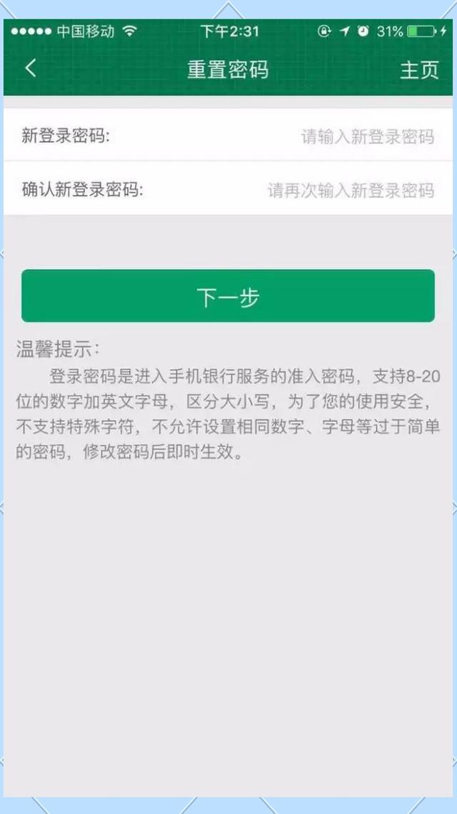 5手机接收到验证码后,把验证码输入限时60秒哦到邮政储蓄手机银行短信验证页面,然后点击“下一步”6在邮政储蓄手机银行“忘记密码”页面,输入机主“姓名”身份证“证件号码”银行卡“账号”,然后点击“下一步”7在邮政储蓄手机银行“重置密码”页面,输入“新登录密码”并“确认新。
