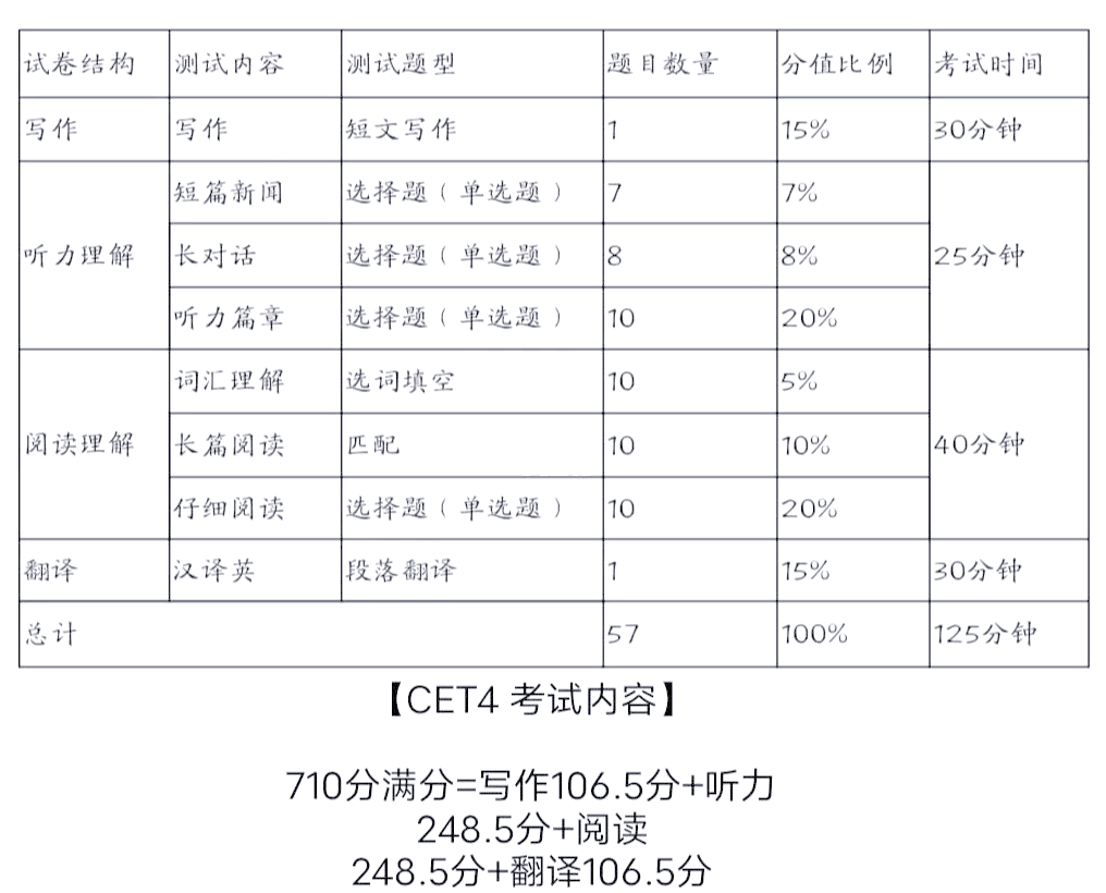 英语四级考试各题型分数分配如下一写作部分 写作部分满分106分,这部分的分数占比非常重要,反映考生的英语书面表达能力二听力部分 听力部分满分248分,包含短对话长对话短文理解和听力填空等题型其中短对话占比较高,主要考察考生对日常对话内容的理解能力三阅读理解部分 阅读理解部分满分;4将英语四级中文翻译成英语15%30分钟= 1065分据报告满分为710分国家大学英语4级和6级考试委员会将考试成绩为220分或更高的考生交给成绩单,国家英语四级考试规定“达到四级425分或以上的人可以申请六级考试” 一般认为英语四级及格分数为425分二英语四级考试各部分分值分布 英语四级;大学英语四级各部分分值如下作文占比15%,共107分快速阅读占比10%,共70分听力占比35%,共249分听力部分是四级考试中分值最高的部分,需要考生重点练习和提高篇章阅读和词汇阅读合计占比25%,共179分这部分主要考察考生的阅读理解和词汇运用能力完型填空占比10%,共70分;分布情况为写作部分占1065分15% ,听力部分占2485分35%,阅读理解部分占2485分35%,汉译英部分占1065分15% 英语四级考试满分为710分英语四级满分为710分,各题型分值分配如下1英语作文 说明写作部分占整套试卷的15% =1065分 达到639分为及格 时间。