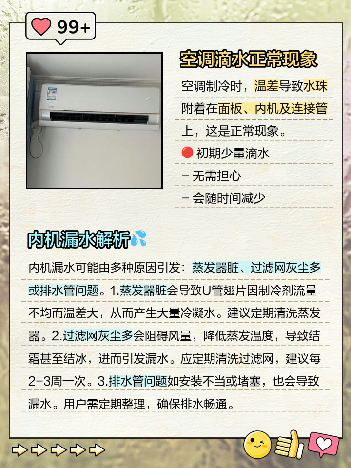 也更加呵护呼吸健康,可以说益处多多3新装空调质量问题或安装不当 空调内机本身存在质量问题,比如接水盘破损固定不到位出水口连接管松动管路保温材料未完全包裹内机没有水平安装等都会导致室内机出现滴水现象,而这类问题一般出现在新安装的空调解决办法及时联系维修人员进行维修处理。