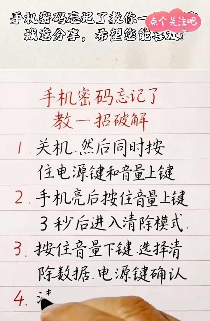 5、以下是一些可能的方法来尝试打开手机1 恢复出厂设置如果忘记了手势密码,可以尝试恢复手机到出厂设置这将删除手机上的所有数据,包括设置和应用,但不会删除保存在云服务中的数据如谷歌账户信息在进行此操作之前,请确保备份重要数据2 使用备份和重置功能如果之前设置了备份和重置功能。
