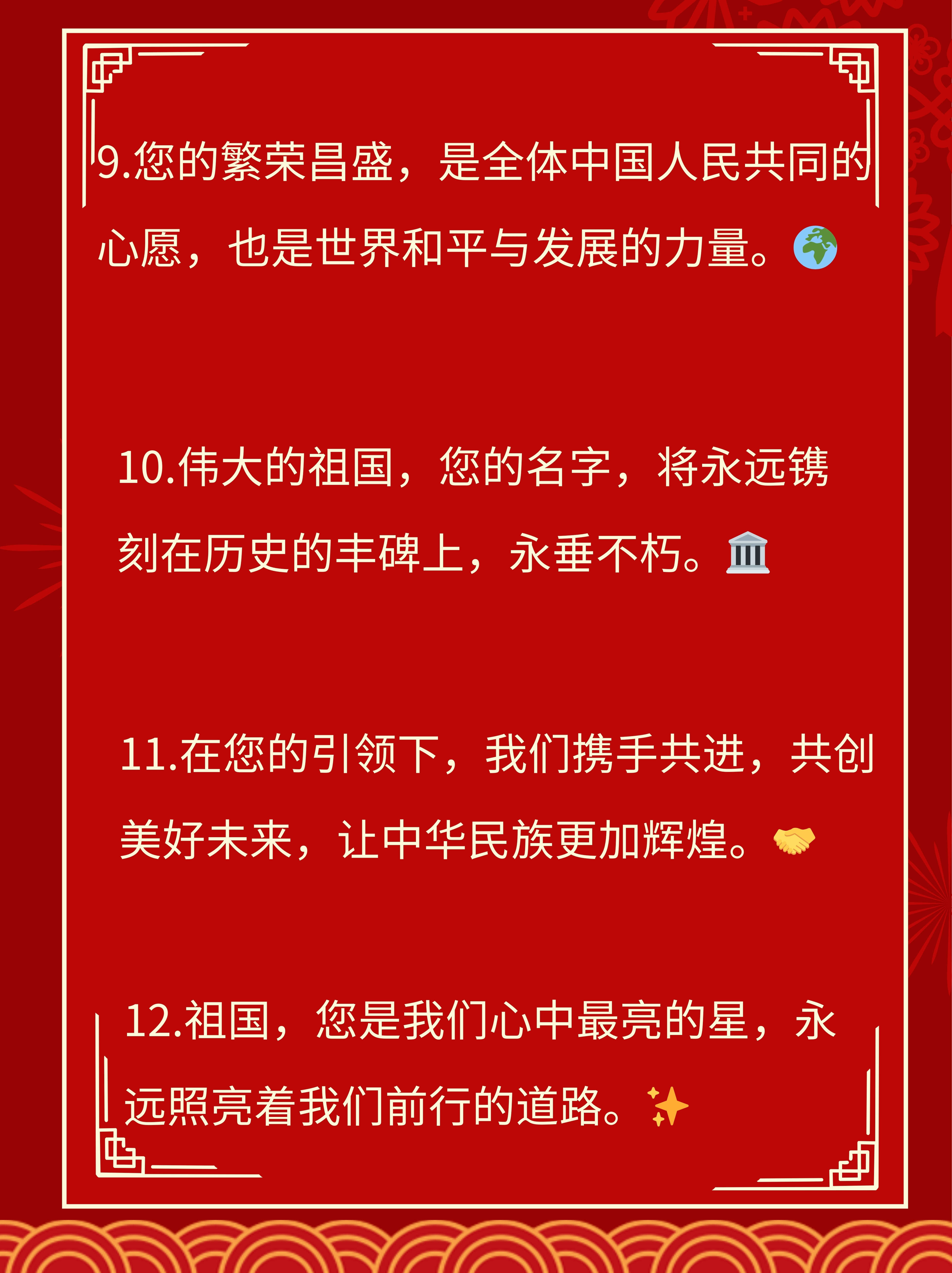 9 祖国强大,我亦强大祖国富裕,我亦富裕,我与祖国息息相关,不可分割10 中华民族崛起,炎黄子孙福泽深厚民族团结,歌舞升平,国家繁荣昌盛11 黄河孕育了华夏民族,长江见证了中华民族的历史伟大的祖国,我们为您自豪,为您歌唱12 我歌颂祖国,愿她永远年轻我传递祝福,愿您幸福。