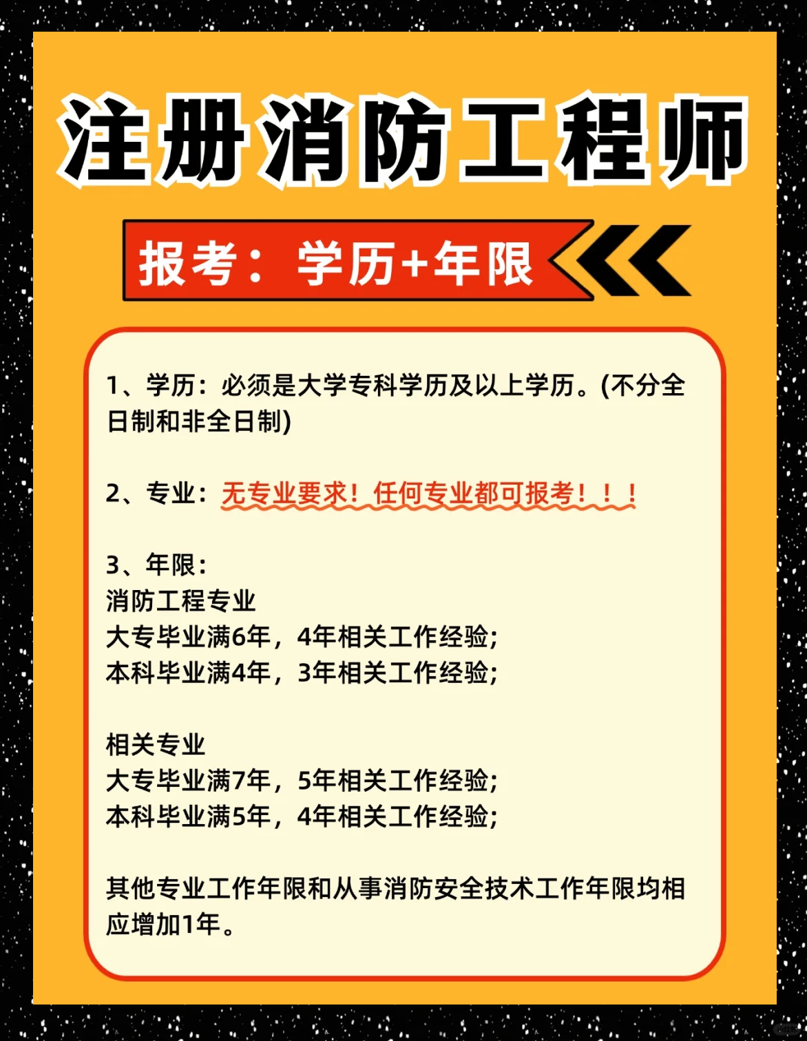 一级消防工程师报名条件在遵守法律法规的前提下,首先满足学历和工作年限的要求最低学历要求是大专,对考生的专业没有限制具体报名条件如下一 消防工程专业大专学历,需工作满6年,从事消防安全技术工作满4年或者消防工程相关专业大专学历,需工作满7年,从事消防安全技术工作满5年二 消防;年龄要求报考一级消防工程师的考生一般需满足26周岁以上的年龄要求其他要求遵守国家法律法规,恪守职业道德报名时需提供真实有效的个人信息和证明材料报名时间一级消防工程师的报名时间通常在每年的8月左右请注意,以上条件可能会根据每年的具体政策有所调整,考生在报名前应仔细阅读并了解当年的;一级消防工程师参加考试没有年龄限制只要考生符合相应的报考要求,就可以直接报名参加考试一级消防工程师的报考条件主要包括以下几点学历及工作年限要求取得消防工程专业大学专科学历,工作满6年,其中从事消防安全技术工作满4年或取得消防工程相关专业大学专科学历,工作满7年,其中从事消防安全技术;消防工程师并非报名就能考,需要满足一定的报考条件具体如下一学历及工作年限要求一级消防工程师报考对学历和工作年限有明确规定以大专学历为例,如果是消防工程专业,需工作满6年,其中从事消防安全技术工作满4年若是相关专业,则需工作满7年,其中从事消防安全技术工作满5年随着学历层次的;一级消防工程师考试在每年的11月5日6日进行,报名时间通常在考试前两个月左右参与一级消防工程师考试要求最低学历为大专,专业不限不同专业的考生在报考时需要满足的工作年限要求各有不同一级消防工程师考试设有消防安全技术实务消防技术综合能力消防安全案例分析三个科目消防安全案例分析。
