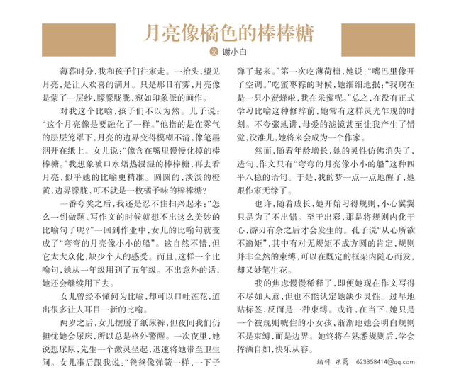 然而,随着年龄增长,她的灵性仿佛消失了,造句、作文只有“弯弯的月亮像小小的船”这种四平八稳的语句。于是,我的梦一点一点地醒了,她跟作家无缘了。