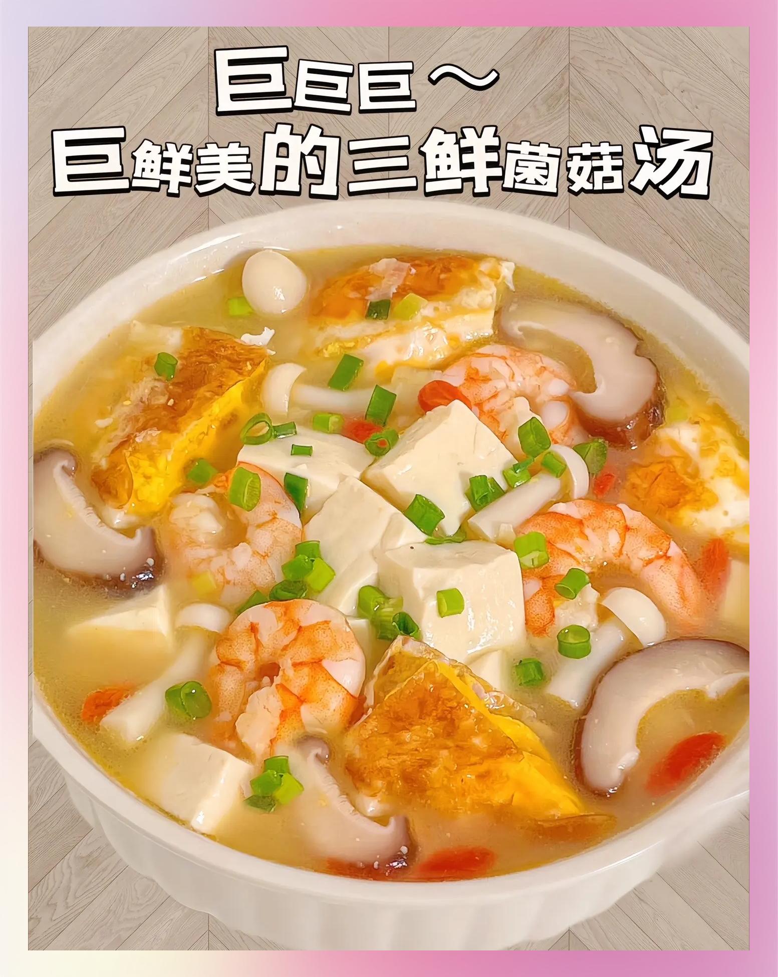 三鲜蘑菇汤的话,我们是用底底料就是肉啊,还有蘑菇啊,还有啊,一种鲜鲜鲜鲜的就是青菜这三种料加起来叫三鲜汤,所以有三种材料;三鲜汤的做法挺多的,这里说一种家常的,材料嫩豆腐杏鲍菇鸡蛋香菜,小葱 水淀粉 香油 做法1,豆腐轻洗洗,切成小条,2,杏鲍菇洗净,切成和豆腐一样的小条,小葱香菜洗净切末,3,鸡蛋打散 4,锅中水烧开,放入杏鲍菇快速焯一下水,捞出备用,5,再把豆腐放进去焯烫一下,捞出备用;首先我们需要准备好蘑菇,白菜,鸡蛋,将蘑菇和白菜先清洗干净,切好,鸡蛋打好搅拌均匀,将锅烧开,放入油,就可以将搅拌好的鸡蛋直接放进去,然后翻炒两分钟,就放蘑菇继续翻炒,放一些调料品就直接加水进去,最后将白菜放进去,焖大概五分钟就可以了;家常三鲜汤的做法如下所需食材 西红柿300g 瘦肉200g 蘑菇100g 制作步骤1 准备食材 取一个西红柿,洗净后切成片备用 取适量蘑菇,洗净后用手撕成小条备用 将瘦肉洗净,剁成肉末备用煮汤底在锅中放入适量水,烧开后加入适量食盐和五香粉加入切好的西红柿片,煮一会,直到;白蘑菇三鲜汤是一道营养丰富味道鲜美的汤品下面教大家几个做好喝的窍门首先,选用新鲜的食材是关键选购白蘑菇时,要挑选色泽光亮表面无斑点的白蘑菇洗净切好备用此外,还需要准备一些鲜虾鱿鱼等海鲜,以及一些鸡肉瘦肉等肉类其次,烹饪过程中要注意火候在烹饪白蘑菇时,要用中火煮。
