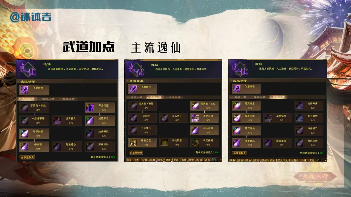 1、天龙八部手游逍遥快速上手及玩法技巧攻略一宝宝选择与技能搭配 重视攻击宝宝在手游中,攻击宝宝的伤害能力不容小觑,尤其在玩家对战中,宝宝的伤害往往能与人物比肩甚至超越因此,优先选择高攻击力的宝宝技能选择攻击宝宝的完美技能搭配应包括法魂痛击咒连击和狡猾狡猾技能能显著提升宝宝;天龙八部逍遥加点攻略掌握最佳属性分配策略 在天龙八部游戏中,逍遥门派的加点策略对于提升角色战斗力至关重要以下是根据逍遥门派特点推荐的加点方案及属性分配建议一加点方案推荐 全灵气加点适用玩家注重法术攻击的玩家优势提高法术攻击力,增加技能效果,适合远程攻击为主的逍遥门派力气;天龙八部逍遥门派攻略如下前期升级策略主线任务为主在游戏的前三十级,主要按照主线任务剧情进行升级此阶段不需要特别关注技能加点,因为前期加点对后期影响不大技能升级随着主线任务的推进,及时升级所提供的技能,以便在30级后有更好的发展属性加点建议优先选择身法对于逍遥门派来说,身法;天龙八部手游逍遥技能主要包括普通技能进阶技能和绝学技能以下是主要技能的详解攻略一普通技能 逍遥步逍遥派的招牌技能,具有极高的闪避率,使玩家在战斗中能够灵活躲避敌人的攻击,是提升生存能力的关键技能风行天下增加自身移动速度,提高追击敌人或逃跑的能力,在战场中灵活穿梭九阳真经;要将天龙八部荣耀版中的逍遥职业玩到最强,可以从以下几个方面进行攻略一职业特点理解 核心优势逍遥以其独特的技能和灵活的战斗方式著称,擅长使用轻功和内功,拥有高闪避率和出色的治疗能力角色定位在团队中,逍遥可担任治疗者输出者或辅助者,具有较高的生存能力和输出潜力二装备搭配优化;天龙八部逍遥加点推荐以灵气和身法为主,辅以少量体力详细解释如下一灵气加点 逍遥在游戏中主要依赖技能输出,而技能所依赖的内攻伤害多取决于灵气属性因此,加点中应当优先考虑增加灵气增加灵气可以提升逍遥的内功攻击力,使其在战斗中可以造成更高的伤害二身法加点 身法对于逍遥派来说。