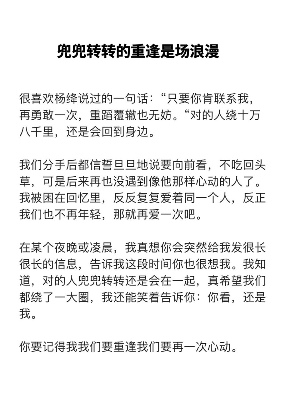 那些曾经走失的日子,就像是生命中的一段插曲,尽管曲折,却也是成长不可或缺的一部分终于有一天,我们会发现,那些曾经以为再也找不到的人或事,竟然在不经意间重逢了正如辛夷坞所言ldquo年轻的时候,我们也曾走失,还好,兜兜转转,原来你还在这里rdquo这份重逢的喜悦,是对过去的一种;关于兜兜转转的爱情,以下是一些相关的句子爱情里的兜兜转转年轻的时候,我们也曾走失,在人生的十字路口徘徊不定,但幸运的是,经过时间的洗礼和命运的安排,兜兜转转,最终发现原来你还在这里,等待着我,这便是最美的爱情命中注定的重逢正如村上春树所言,每个人都有属于自己的一片森林,或许。