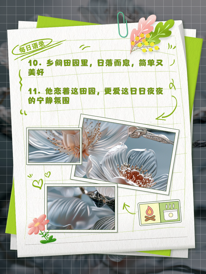 悠闲的田园生活是一种令人向往的生活方式,它充满了诗意与宁静以下是对悠闲田园生活的具体描述宁静自在在田园生活中,可以远离城市的喧嚣,享受一片宁静与自在这里没有繁忙的交通,没有嘈杂的人群,只有大自然的声音和宁静的氛围,让人心旷神怡自然风光田园风光美不胜收,满眼皆是嫩绿与生机。