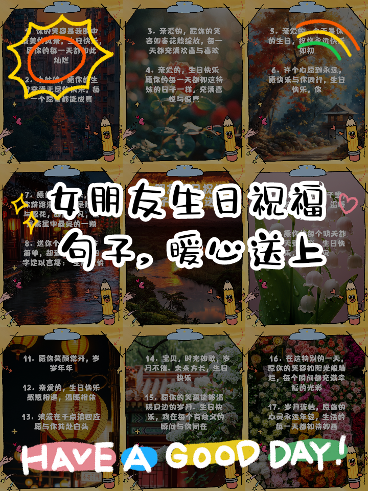 9、以下是一些可以让女朋友感动到哭的生日快乐祝福留言深情告白型亲爱的,遇见你是我此生最大的幸运在你的生日这一天,我愿化作漫天的星辰,守护你直到永远生日快乐,我的爱人浪漫诗意型当流星划过夜空,我许下心愿,愿你的每一天都如诗如画,美丽动人在这特别的日子里,祝你生日快乐,永远。