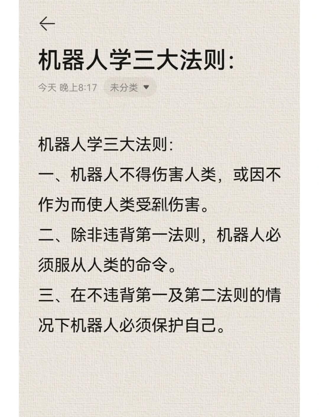 机器人三大定律,是阿西莫夫提出的科幻文学中著名的行为准则,具体表达如下第一定律机器人不得伤害人类个体,或因不作为使人类个体受到伤害第二定律机器人必须服从人类的命令,但前提是这些命令不与第一定律相冲突第三定律机器人在不违反第一及第二定律的情况下,必须保护自身的生存以下是。