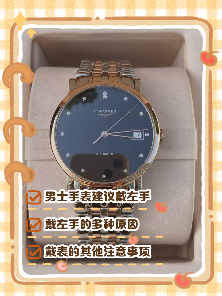 更好地保护手表2 选择右手佩戴也有一些男士会把手表戴在右手部分从事特定职业或有特殊需求的人,比如左撇子,他们左手使用频率更高,戴在右手更方便且不妨碍做事还有一些人出于个人审美和独特风格的追求,为了让手表与佩戴的其他饰品,如左手的戒指手链等搭配协调,会选择将手表戴在右手;1 手表的调节装置,如发条和时间调整按钮,通常位于表盘的右侧2 因此,将手表戴在右手会感到不习惯3 大多数男士习惯将手表戴在左手,这样做在工作和生活活动中更为方便4 国际上普遍认同的是,左手是佩戴手表的传统选择5 男士腕表通常应戴在左手手腕上,确保皮质表带贴合手腕皮肤6。
