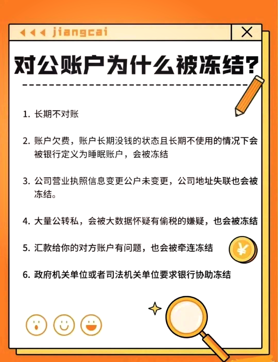 13、公司账户冻结的原因主要有以下几点与银行的财务纠纷如果公司与银行之间存在未解决的财务问题,如贷款逾期透支未还等,银行有权根据相关规定冻结公司的账户,以保障其债权不受损失法院或检察院的冻结当公司涉及法律诉讼或涉嫌违法犯罪行为时,法院或检察院有权依法对公司账户进行冻结这通常是为了。