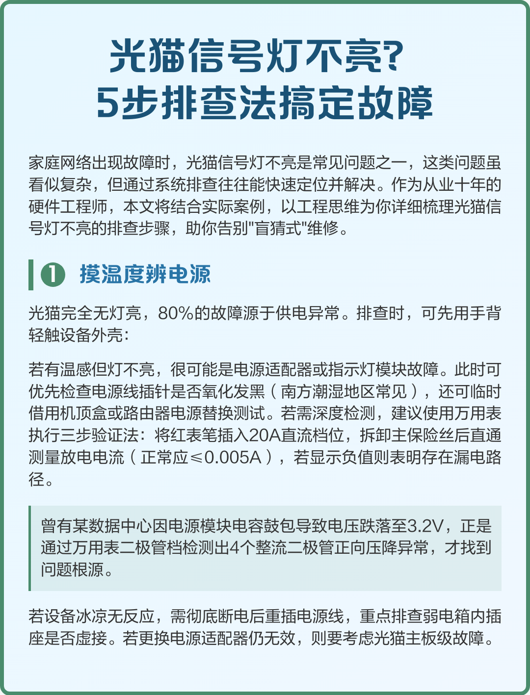 在排查过程中,我还注意到光猫上的光纤G指示灯会频繁闪烁,这进一步证明了可能存在线路问题频繁闪烁的指示灯可能意味着光信号不稳定,这可能是由于光纤连接不良光纤损坏或其他硬件故障引起的在这种情况下,更应该尽快联系中国移动的专业技术人员进行检修综上所述,如果遇到光信号灯不亮的问题,首先。