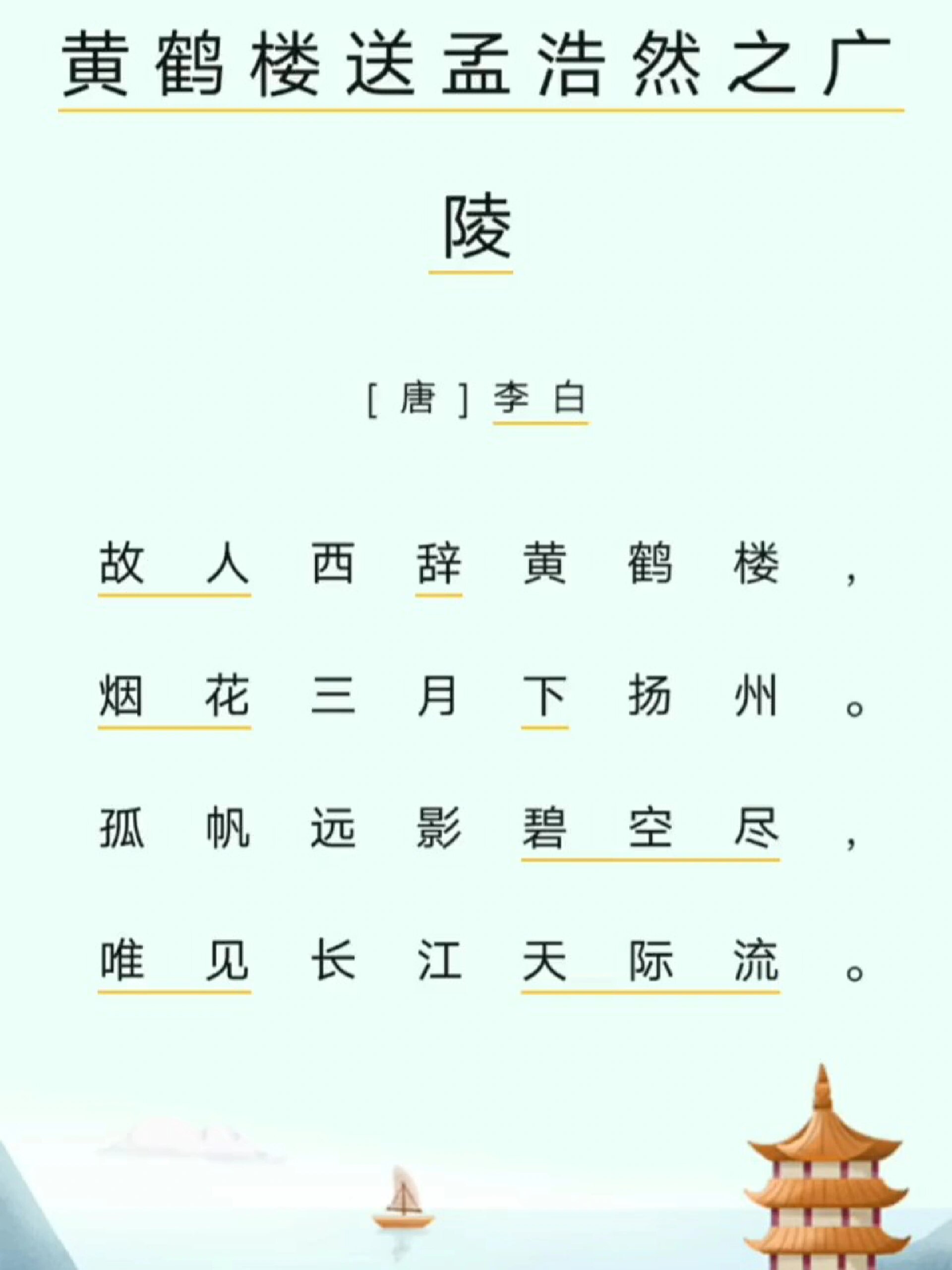 全诗为黄鹤楼送孟浩然之广陵 故人西辞黄鹤楼,烟花三月下扬州孤帆远影碧空尽,唯见长江天际流译文旧友告别了黄鹤楼向东而去,在烟花如织的三月漂向扬州帆影渐消失于水天相连之处,只见滚滚长江水在天边奔流作者唐·李白。