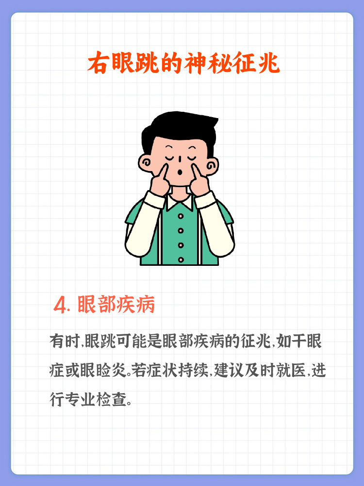 右眼跳并不是跳灾的预兆,这一说法没有科学依据实际上,“眼皮跳”可能是人体某种疾病的先兆以下是对这一现象的详细解释一眼皮跳的科学解释 眼睑与轮匝肌在医学中,眼皮被称为“眼睑”眼睑内有一片很薄的肌肉,叫做“轮匝肌”,它围着眼睛成轮形生长轮匝肌的收缩会引发眼睑的收缩。