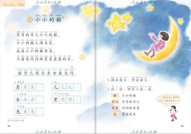 《小小的船》:现收入统编语文教材一年级上册第七单元第五课。这是一首充满童趣和想象力的儿童诗,通过形象的比喻和生动的描绘,展现了一个梦幻般的夜空世界,表达了孩子对美好事物的喜爱、对探索未知的渴望。这些情感和意境共同构成了一个充满想象和诗意的世界。