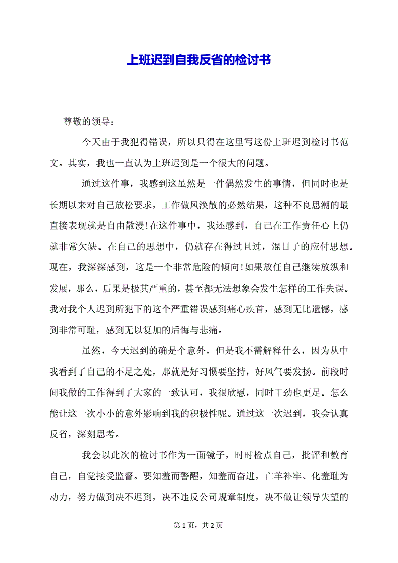 尊敬的领导我在此郑重致歉,对于今天上午的迟到行为,深感懊悔我明白,任何理由都只能为我自己的错误找托词,因此,我选择面对自己的过错,进行深刻的反省和自我检讨一直以来,我并未对准时上班的重要性有足够认识,经常迟到几分钟到办公室,虽然我总找借口为自己开脱,但意识到这是极其不负责任的。