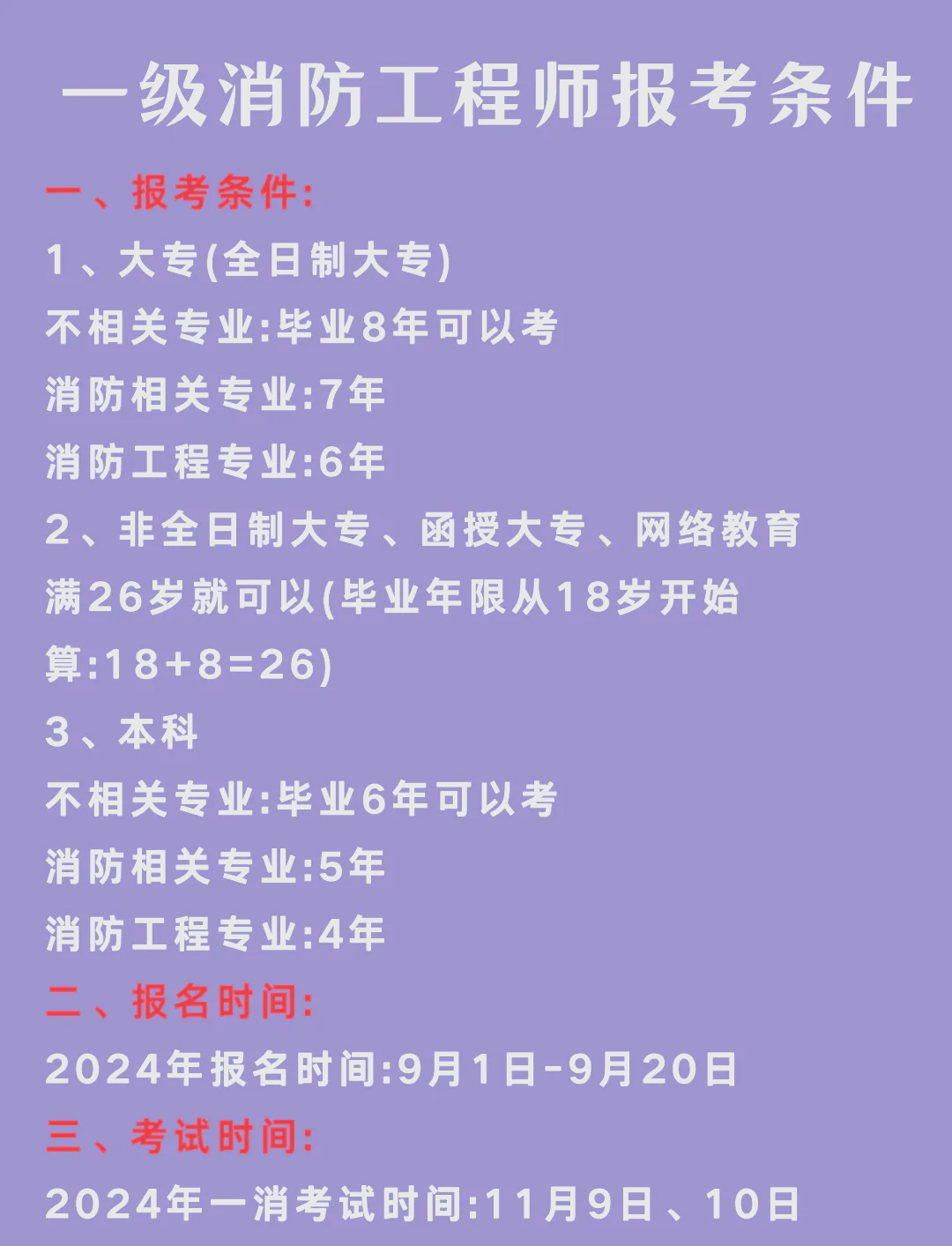 报名时间消防工程师考试报名时间通常为每年的8月至9月,但各地报名时间可能会有几天的差异考生需密切关注当地考试机构或相关部门的通知,以确保及时报名考试时间消防工程师证书考试时间固定在每年的11月初左右考试为全国统一大纲统一命题统一组织,因此考试时间在全国范围内是一致的考试科目及。