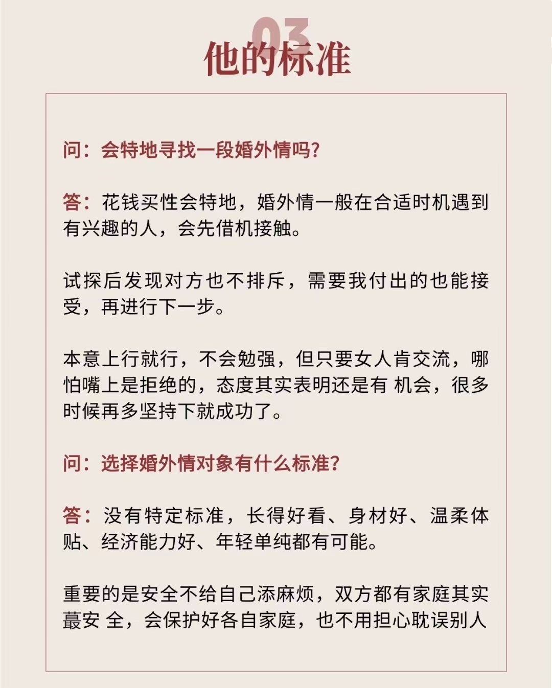 2寻求刺激 有的夫妻觉得生活太过平常,缺少惊喜和刺激,而影视剧中的男女主人公却与情人爱意缠绵,潇洒自在,自己也想体验一下这种生活,在这种好奇心理的驱动下产生了婚外恋其实,平平安安就是福,有很多人都是身在福中不知福 3贪财贪权 有的人因为贪图对方的#39钱财,不顾尊严和人格主动委身;因此,婚外恋确实有可能是通过频繁的聊天逐渐发展起来的在聊天的过程中,双方可能会逐渐产生好感形成习惯,并在想象中无限美化对方然而,这种行为是不道德的,并且可能会对家庭和个人造成严重的伤害为了避免婚外恋的发生,建议已婚人士在与异性交往时保持适当的距离和界限感不要抱有侥幸心理,好奇。