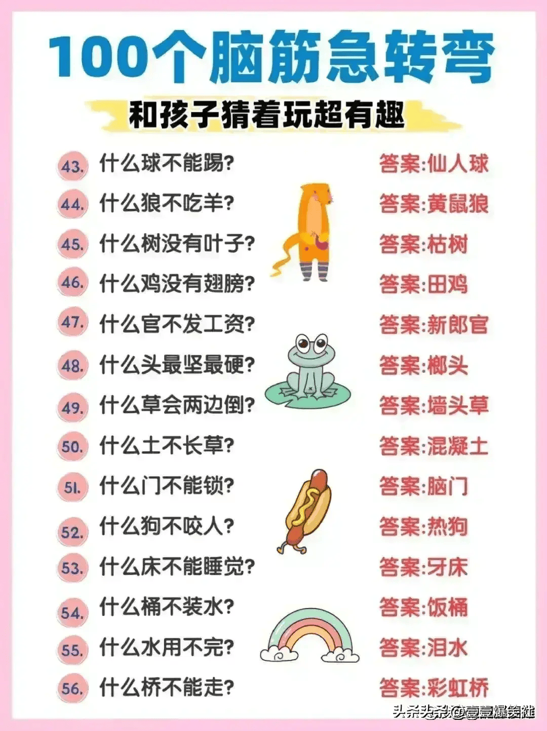 1、17 地球上什么地方的出生率最高答案产房18 3050哪个数字比熊的大便厉害答案40事实胜于雄熊辩19 你只要叫它的名字就会把它破坏,它是什么答案沉默20 老王每天都要刮很多遍脸,可脸上还是有胡子为什么答案他是在替别人刮脸21 一个人有三根头发,为什么他还要剪掉一根。