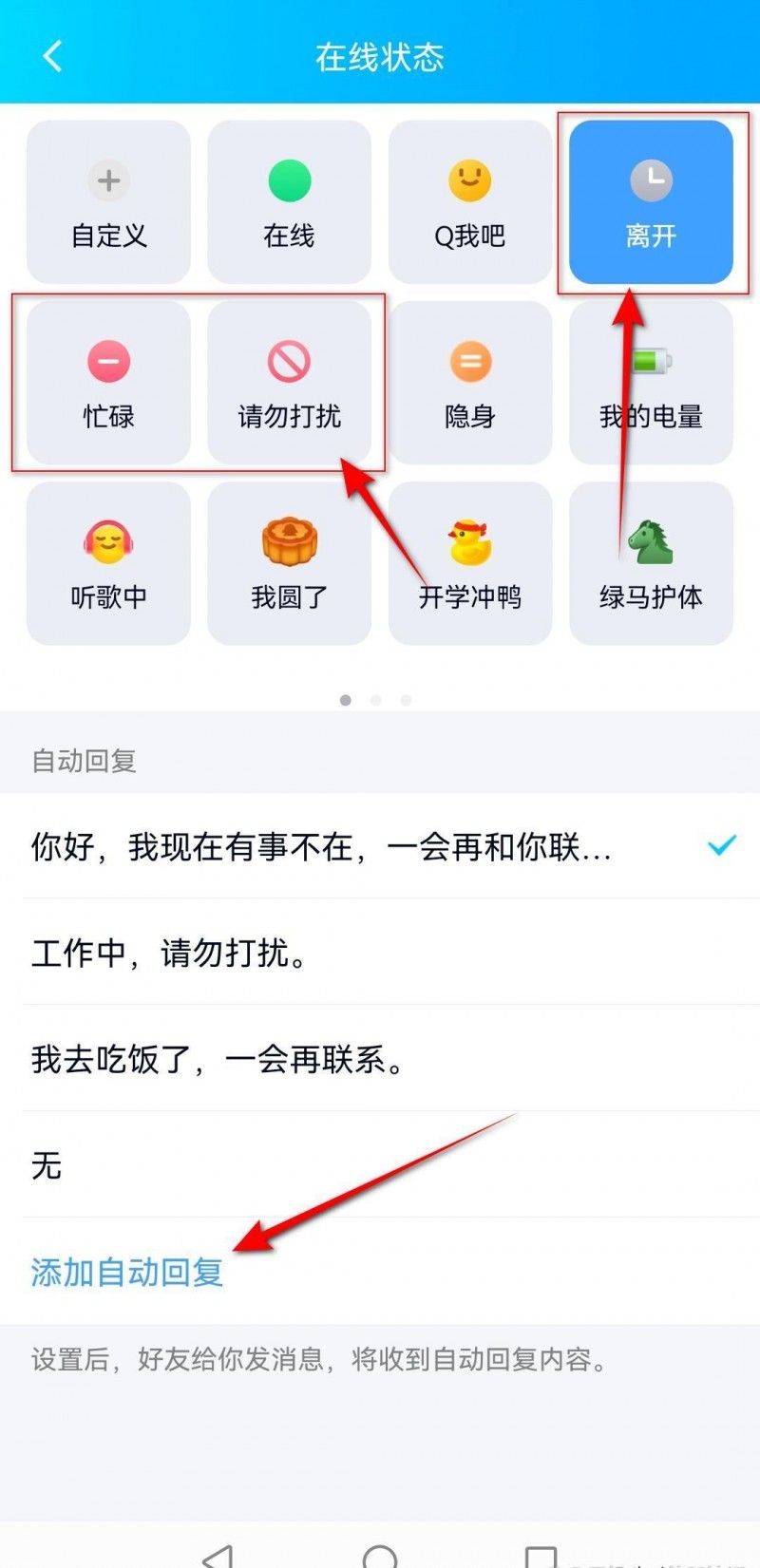 通过账户管理设置自动回复 打开手机客户端,点击左上角的头像图标在弹出的菜单中,点击左下角的“设置”按钮进入设置界面后,找到并点击“账户管理”在账户管理界面中,点击“在线状态”将在线状态切换为“忙碌”或者“请勿打扰”这时会弹出自动回复的选择框,可以选择预设的回复内容,或者按照。