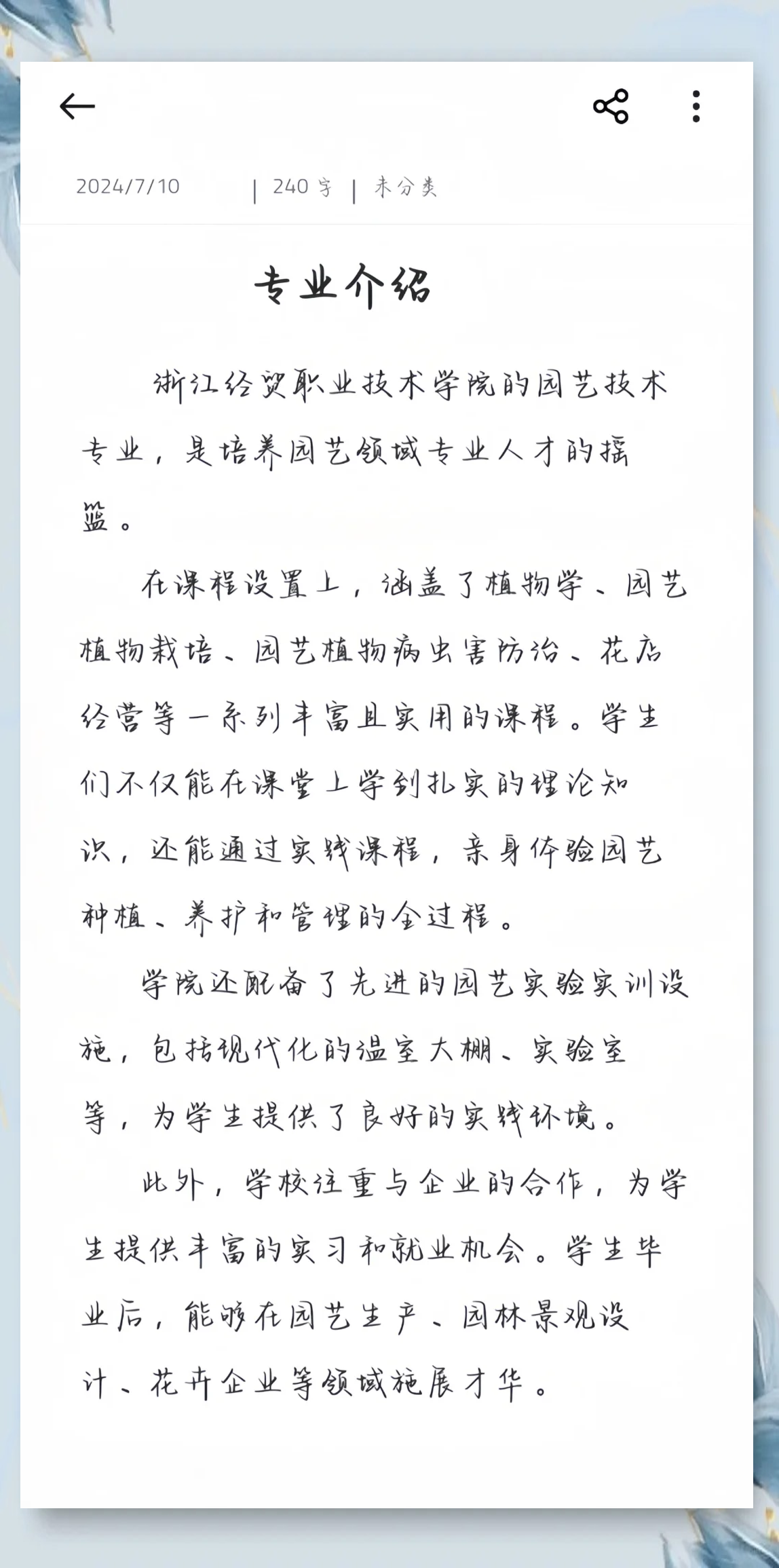 园艺技术专业主要学习园艺作物的栽培育种病虫害防治园艺产品贮藏加工以及园艺场规划设计等方面的知识和技能具体来说园艺作物栽培学习不同园艺作物的生长习性栽培技术和管理方法,以确保作物健康生长并达到高产优质育种技术研究园艺作物的遗传规律,学习通过杂交选择等手段培育新品种,以满足市。