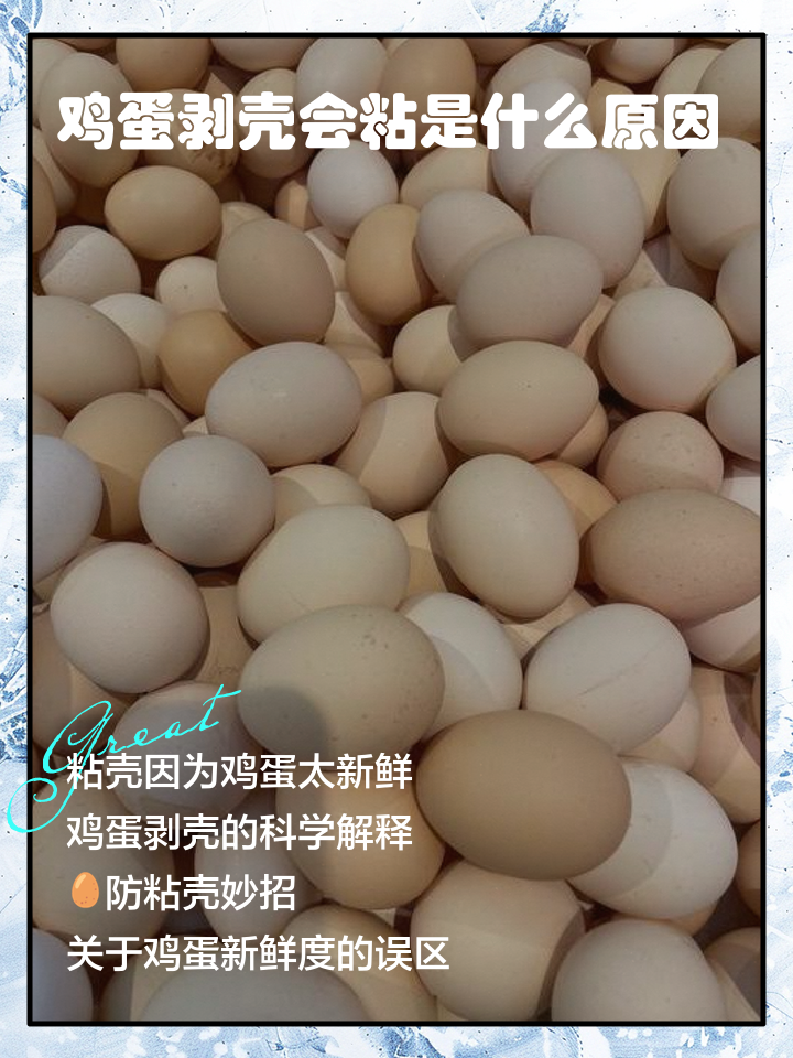 9、剥鸡蛋不粘壳的方法有以下几种1 滚动按压法 步骤将鸡蛋比较大的一端往桌上轻轻磕一下,然后用手掌按住鸡蛋在桌上滚一圈 原理通过滚动按压,可以使蛋壳与蛋白之间的连接变得松动,从而更容易剥壳2 凉开水摇晃法 步骤找一个有盖的容器,将鸡蛋放入,倒入凉开水没过鸡蛋,然后盖上。